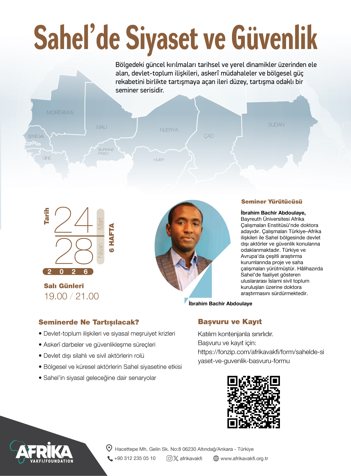📍 Altı hafta sürecek bu ileri düzey seminerde; devlet–toplum ilişkileri, askerî darbeler, güvenlikleşme süreçleri, devlet dışı aktörlerin rolü ve bölgesel/küresel güç rekabeti tartışmaya açılacaktır. Program, Sahel’in siyasal geleceğine dair olası senaryolar üzerine kapsamlı bir değerlendirme sunmayı amaçlamaktadır.